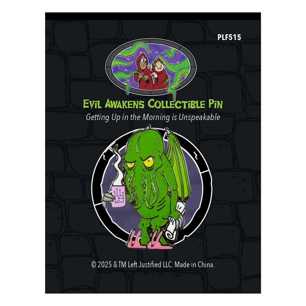 Delight in this collectible pin featuring Cthulhu with his coffee, newspaper, and bunny slippers. Pin him to your ceremonial robes β or anywhere else you keep your most fearsome decorations β to remind you that Dread Cthulhu hates the sunrise even more than you do.